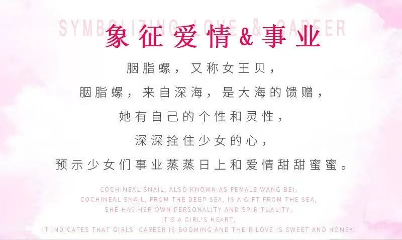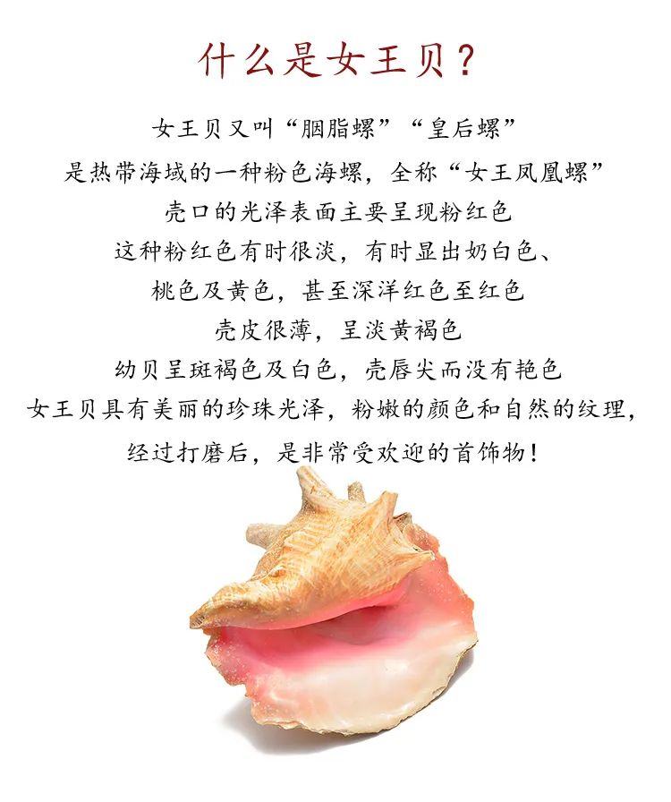 天然女皇贝(贝类的一种,又称“女王贝”、“女王凤凰螺”、“胭脂螺”,天然材质,故每一粒的颜色、花纹均有不同,追求和图片一致的宝宝请绕道。表面会有生长纹或者小坑点,非瑕疵,介意的宝宝也请绕道。) 桃花天然玉髓(天然材质,故每一粒的颜色、花纹均有不同,追求和图片一致的宝宝请绕道。表面会有生长纹或者小坑点,非瑕疵,介意的宝宝也请绕道。 |
